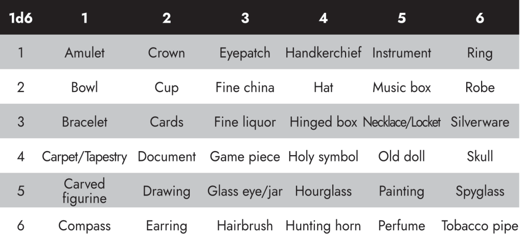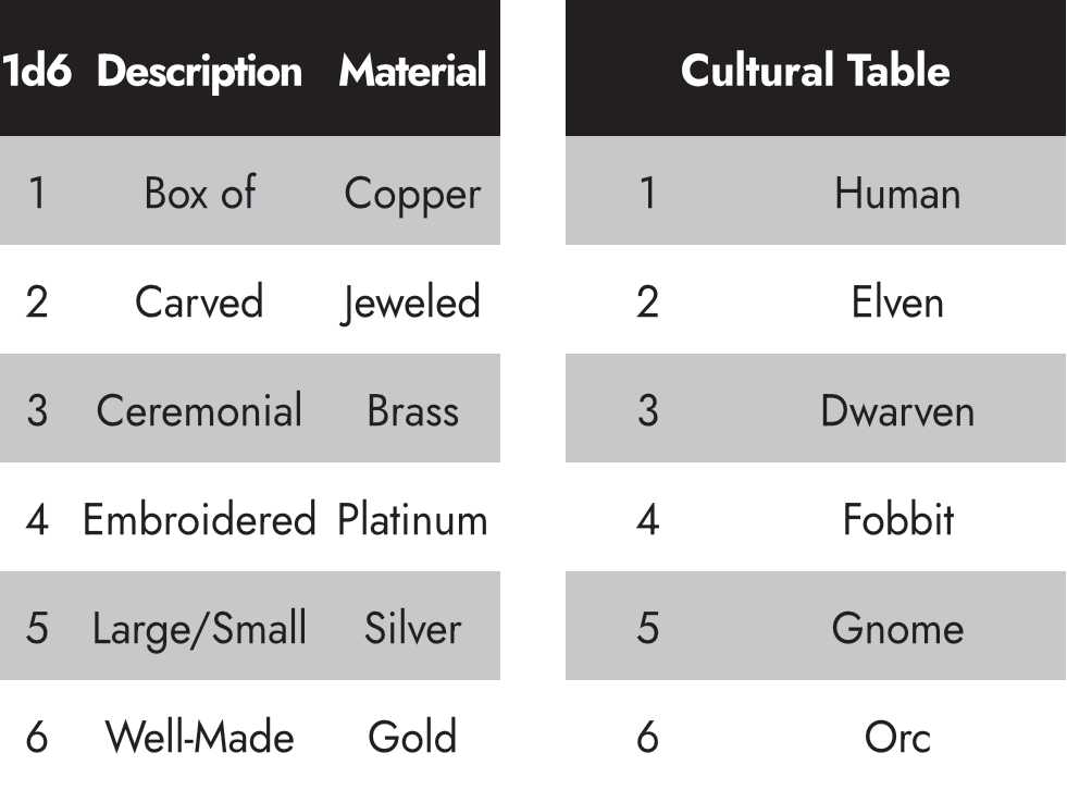 For the total worth of the art objects, take the total of the initial 3d6 roll and multiply by 100, dividing by the number of art objects. (Salt and pepper to taste.) My campaigns don’t tend to focus on trade goods or mundane items. If yours do, feel free to adjust the tables to your tastes.