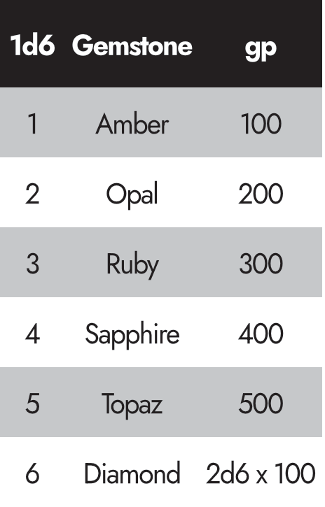 Take the highest d6 result. You can use the same pairs from the Art Objects grouping to generate the type and worth of gemstones using this table.