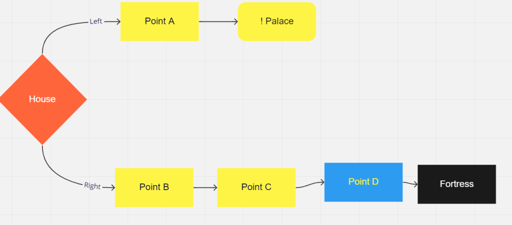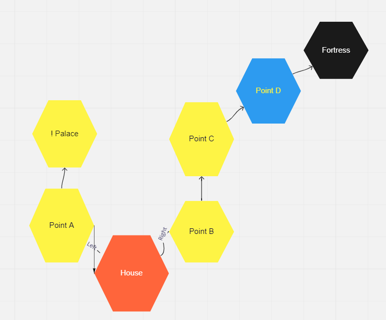 Real quick: let’s say Point A is a goblin fight. Point B is an orc fight. Point C is a displacer beast. Point D is a seaside port town. ! Palace is a friendly witch hut. Fortress is the boss’s stronghold. Just to help contextualize these in a fantasy adventure.
