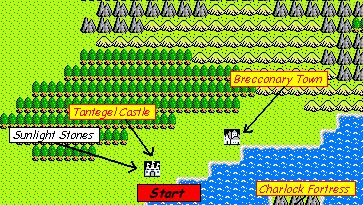So now I enclosed the whole thing in water; it’s a small isolated island. The enemy fortress is surrounded by mountains that the players are ill equipped to climb, so the only way in is through the road & the town (Point D).