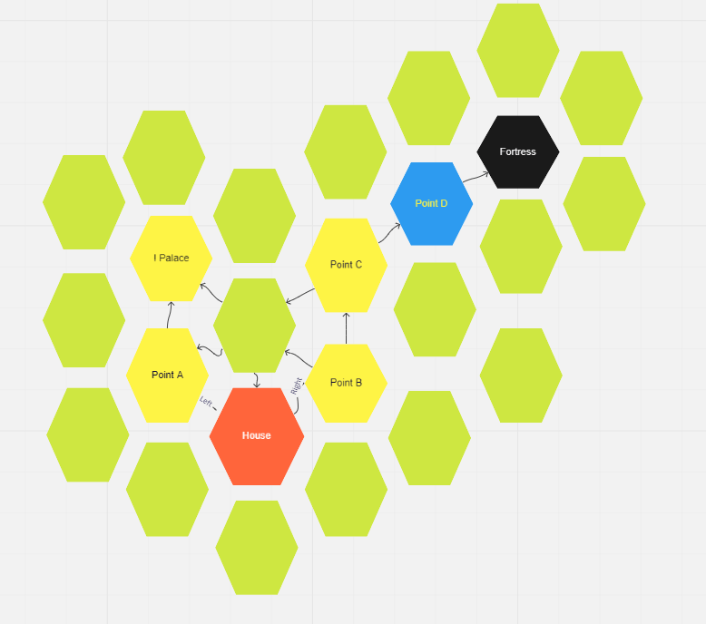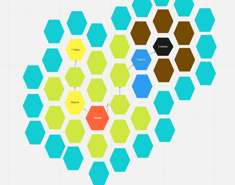 For fun, on my Miro board here, I changed everything to hexes and aligned them a little bit more in the orientation we might expect for a hexcrawl. Now, these are distinct “levels” or points of interest. Maybe each one is a town, or just a random encounter.