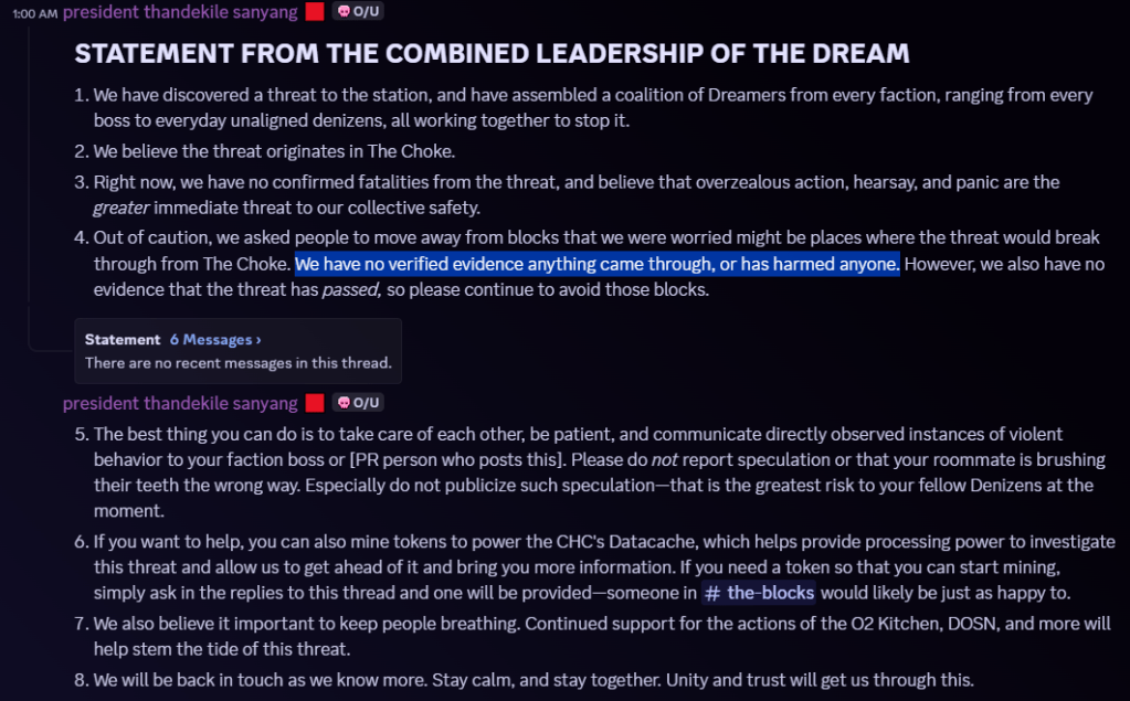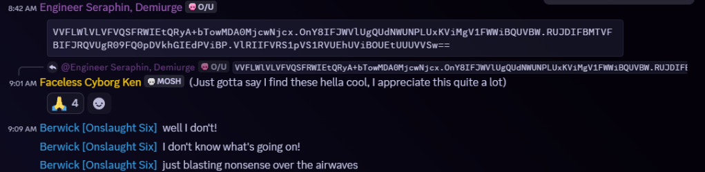 While this is happening, I also am added to a thread called CODE BREAKERS CLUB, a space dedicated for hacker cowboys and other interested folks to decode weird messages like this that appear on the station. Most of them aren’t related to this “plotline,” so I won’t be mentioning them. But the people involved in this thread were instrumental in deciphering the above messages and many others, so shout out to them doing the real work. Until the timing of the incident, nothing in their thread is really too relevant to the incidents at hand, so I’m going to gloss over it.