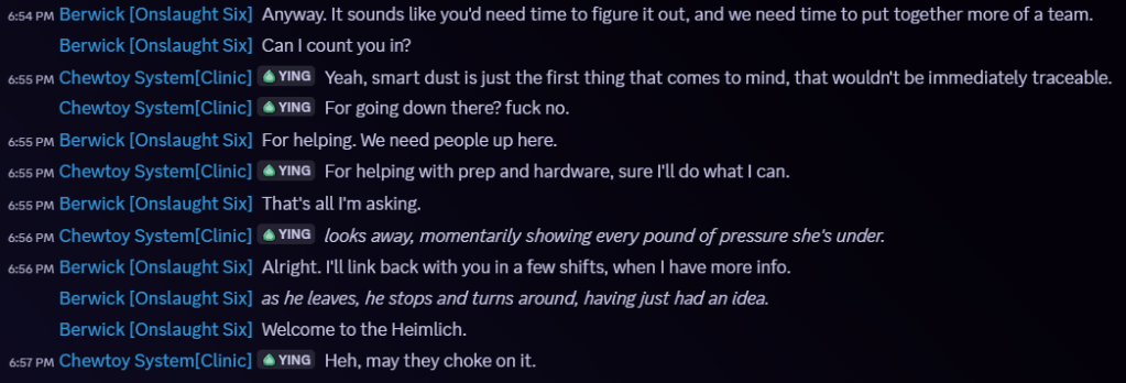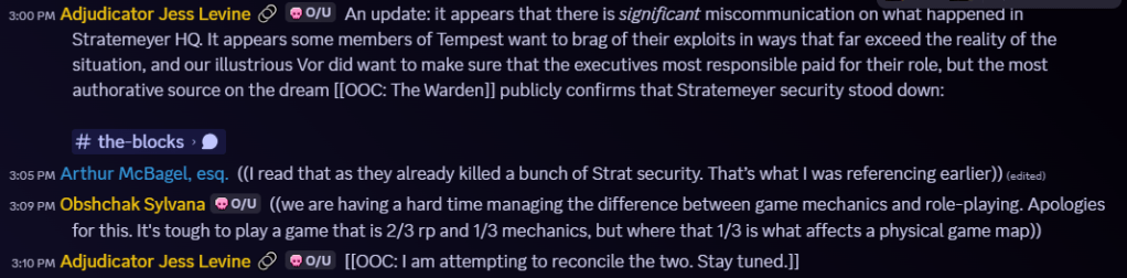 Somewhere in here, the Stratmeyer corpo faction completely dissolves, somehow. Crazy shit that I had no part in, but the first thing to happen on the craziest day.