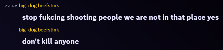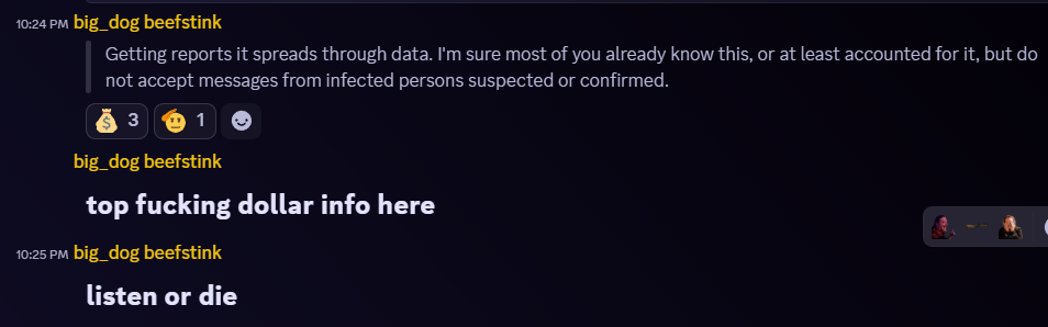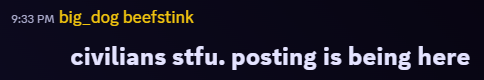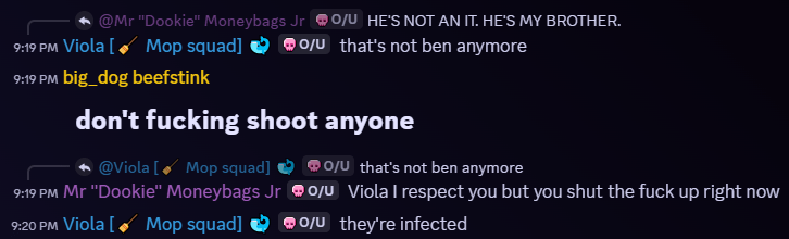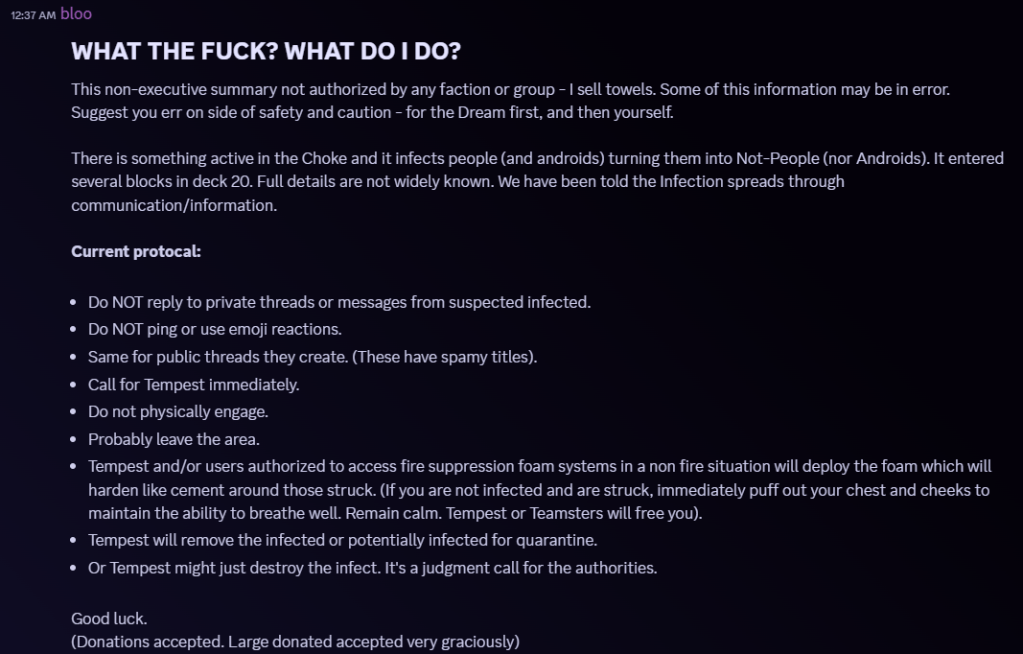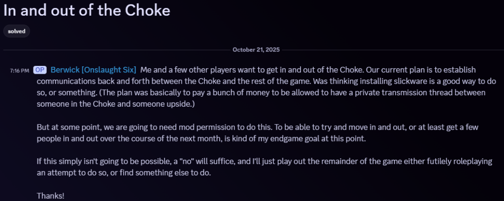 People went to the bosses and mods with evidence of the infection and the response was, well, weird. I don’t have all the details and you can go dig it up yourself. There were multiple out of character vent threads. Now there’s a lot of arguing about the wargame component of the server and how that influences or doesn’t influence player faction agendas but that’s not something.