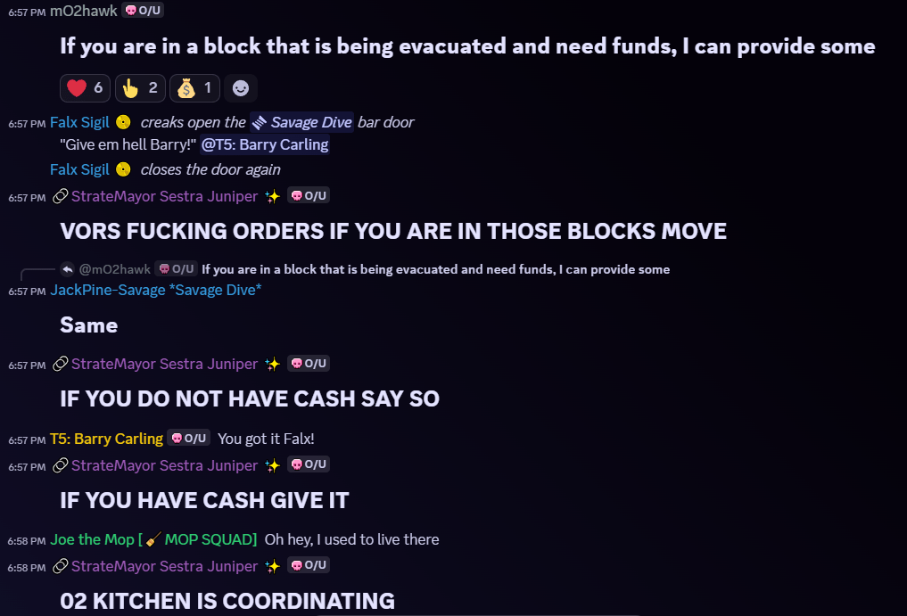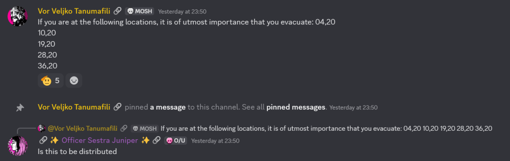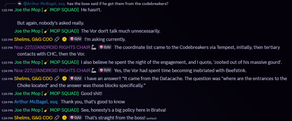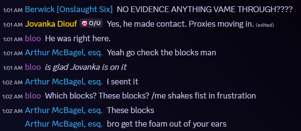 I can’t tell you everything that happened here after. It lasted for multiple hours in game. I think it slowed down around 2am local. The last post from Mouth of the Choke is at 10pm local, meaning it went on for at least three hours. While this is initially happening, we are trying to solve the next Ariel message. I am only half paying attention to the chaos in the Blocks.
