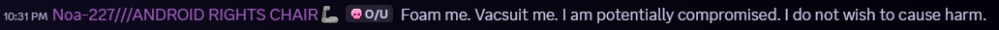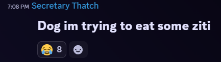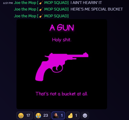 While hanging out, I participate in some threads. Each thread is like its own location or a private conversation. I hang out in the Wet Room, a place where the Mop Squad dumped 20 buckets of water. I go to the lesbian bookstore and ask if there is any Luke Gearing material. I do a few union jobs, which consist of doing reaction emojis and heavy physical labour related roleplay scenarios, literally just for fun. Sometimes these jobs pay out a little bit of dough, too. (I do these because my fantasy is to perform physical labour in an environment where my contributions are valued and fairly compensated.) Routinely, I ask if anyone has been to the Choke and back yet.