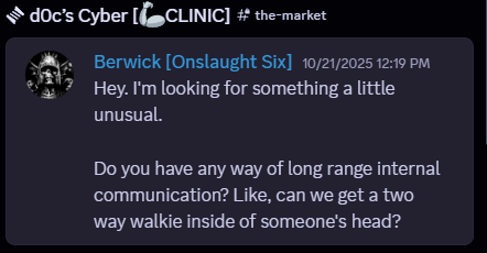 At noon local, I ask a ripperdoc if they could put comms inside of a person that would not show up on scanners or be able to be confiscated/deactivated.